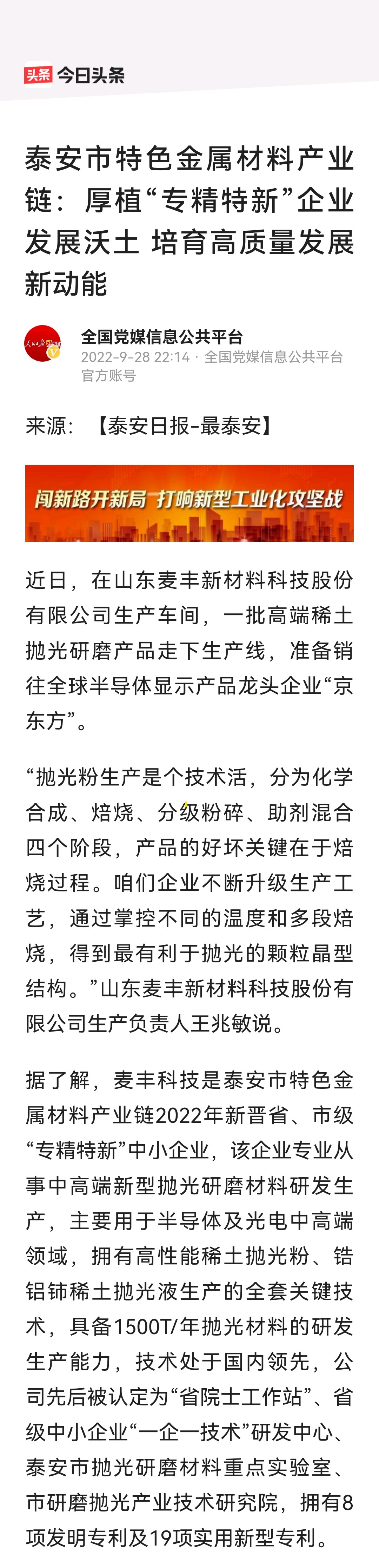 近日,大眾網(wǎng)、泰山日報(bào)、ZAKER泰安等多家媒體以麥豐為主線,刊發(fā)《泰安市特色金屬材料產(chǎn)業(yè)鏈:厚植“專精特新”企業(yè)發(fā)展沃土 培育高質(zhì)量發(fā)展新動能》文章。