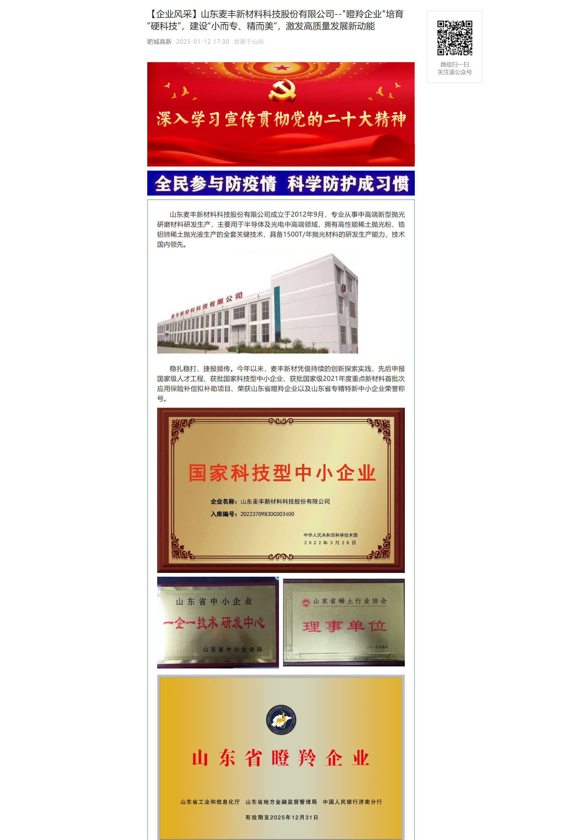 肥城高新公眾號刊發(fā)《山東麥豐新材料科技股份有限公司"瞪羚企業(yè)"培育“硬科技”,建設“小而專、精而美”,激發(fā)高質(zhì)量發(fā)展新動能》文章
